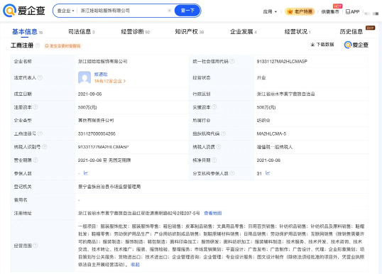 浙江娃哈哈服飾有限公司成立于2021年9月,法定代表人為鄭道哈,注冊資本500萬元人民幣,經(jīng)營范圍包括服裝服飾批發(fā)、服裝服飾零售、箱包銷售等,由杭州娃哈哈宏盛食品飲料營銷有限公司、麗水音速新零售有限公司、浙江銀基貿(mào)易有限公司分別持股40%、35%、25%。