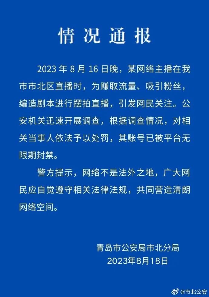 8月18日,青島市公安局市北分局微博賬號“@市北公安”通報稱,某網(wǎng)絡主播在青島市市北區(qū)直播時,為賺取流量、吸引粉絲,編造劇本進行擺拍直播。公安機關對相關當事人依法予以處罰,其賬號已被平臺無限期封禁?!?二驢#”“#警方通報網(wǎng)傳二驢直播被綁架#”等多個話題閱讀量近6.7億。輿論對此結果表示認同,評論稱“山東警方果斷調(diào)查處置,結果大快人心”。