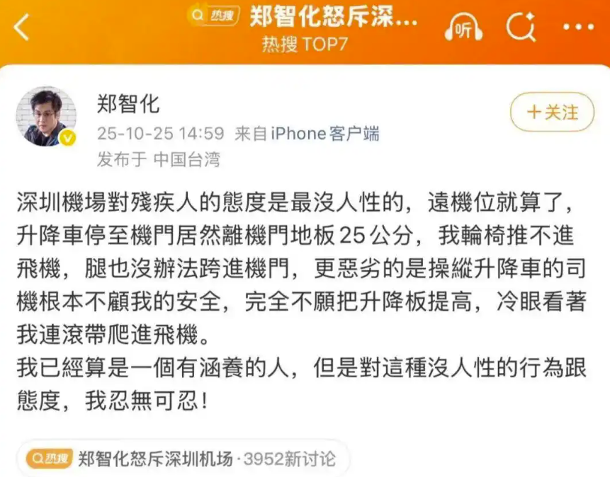 10月25日14時59分,中國臺灣歌手鄭智化通過微博賬號發(fā)文控訴其在深圳機場遭遇“不人性”對待:“操縱升降車的司機根本不顧我的安全,完全不愿把升降板提高,冷眼看著我連滾帶爬進飛機?!?小時后,相關話題出現在微博熱搜榜上,引發(fā)網民一致聲討涉事機場。當日18時許,深圳機場在該微博評論區(qū)留言致歉,表示已啟動核查,將以此為契機優(yōu)化特殊旅客的服務保障細節(jié)。23時許,深圳機場通過微信公眾號再發(fā)情況說明,稱將進一步完善廊橋靠接保障、人員增配等多項整改措施,更好幫助旅客安全順暢登機。