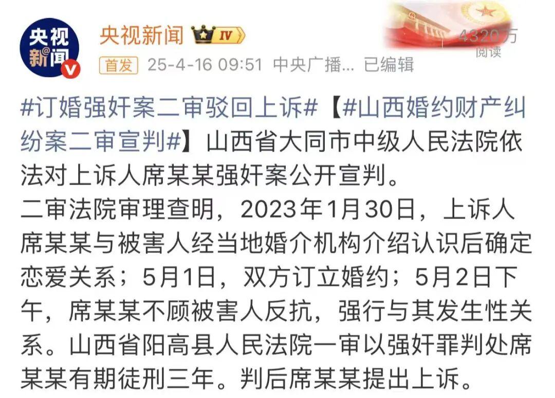 據(jù)澎湃新聞等媒體報道,2025年3月25日,山西大同“訂婚強奸案”當(dāng)事人席某某強奸上訴案及涉婚約財產(chǎn)糾紛上訴案,在大同市中院不公開審理。庭審過程中,受害人和被告人雙方重點圍繞是否實質(zhì)性發(fā)生關(guān)系、案件新證據(jù)證明力等問題展開辯論。4月2日,被告人席某某母親鄭某某前往大同市檢察院提交控訴材料,請求對陽高縣公安局和縣檢察院涉及本案的12名辦案人員以涉嫌程序違法、玩忽職守追究責(zé)任。4月16日,大同市中院二審公開宣判,裁定駁回上訴,維持原判,席某某因強奸罪被判處有期徒刑三年。同日,對于該案所涉的婚約財產(chǎn)糾紛案,二審法院駁回上訴、維持原判。法院宣判后,辦案法官通過“@人民日報”“@央視新聞”進行釋法解讀,圍繞席某某強奸罪名為何成立、認定強奸事實的主要證據(jù)、女方是否騙婚、為何沒有判處席某某緩刑、審判是否受到輿論影響等方面作出回應(yīng)。5月14日,媒體報道稱,山西大同“訂婚強奸案”被列入人民法院案例庫,意味著該案例對類案審判具有示范價值,再次引發(fā)輿論熱議。