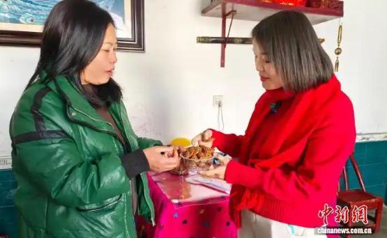 “鄉(xiāng)村CEO”廖紅(右)來到村民家收購土特產(chǎn)。中新社記者 唐小晴 攝