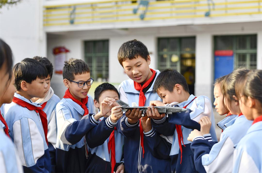 圖為在肥東縣長(zhǎng)臨河學(xué)校中心小學(xué),孩子們觀摩裝備模型。