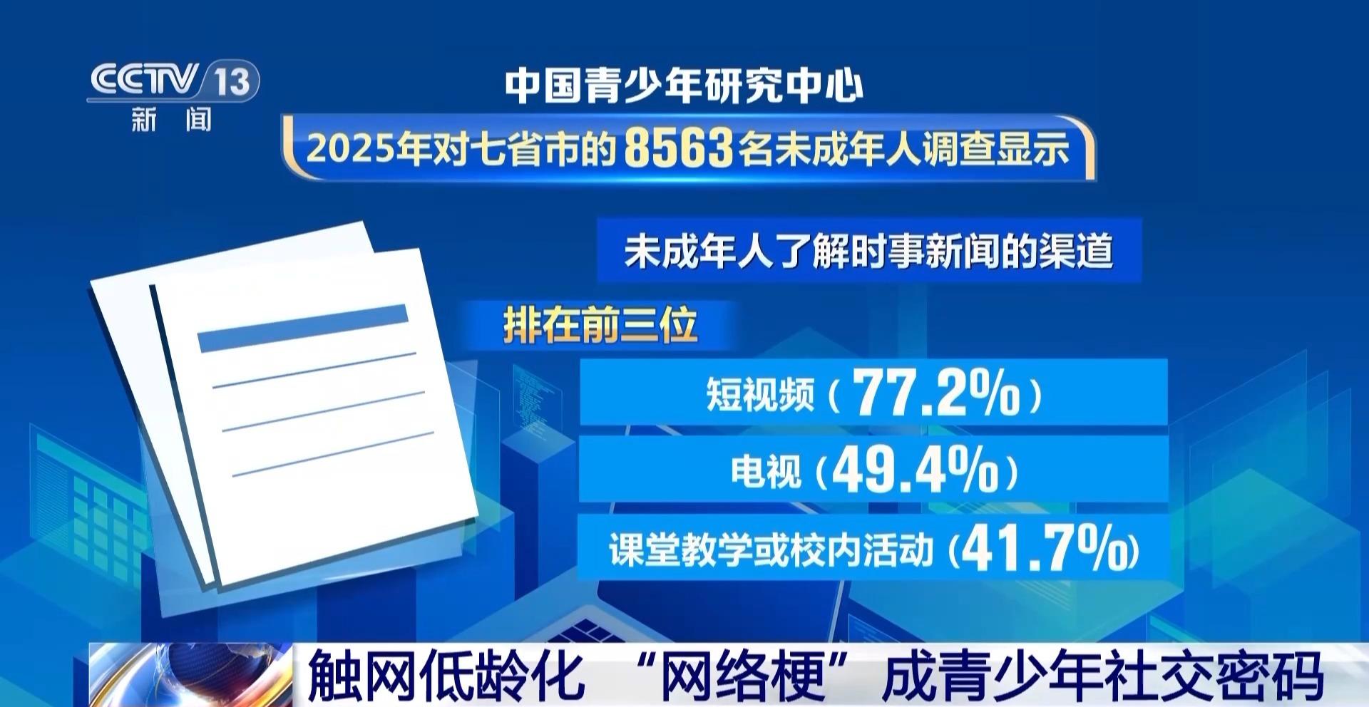 中國青少年研究中心2025年對七省市的8563名未成年人調(diào)查顯示,未成年人了解時事新聞的渠道排在前三位的分別是短視頻(77.2%)、電視(49.4%)、課堂教學(xué)或校內(nèi)活動(41.7%)。