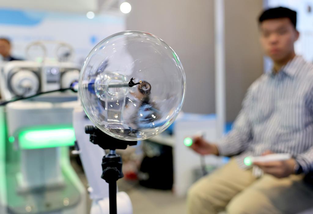 在上海舉行的第91屆中國國際醫(yī)療器械博覽會(CMEF)上,工作人員現(xiàn)場通過智能筆對一個全柔性微型內鏡手術機器人進行操控演示(2025年4月8日攝)。新華社記者 方喆 攝