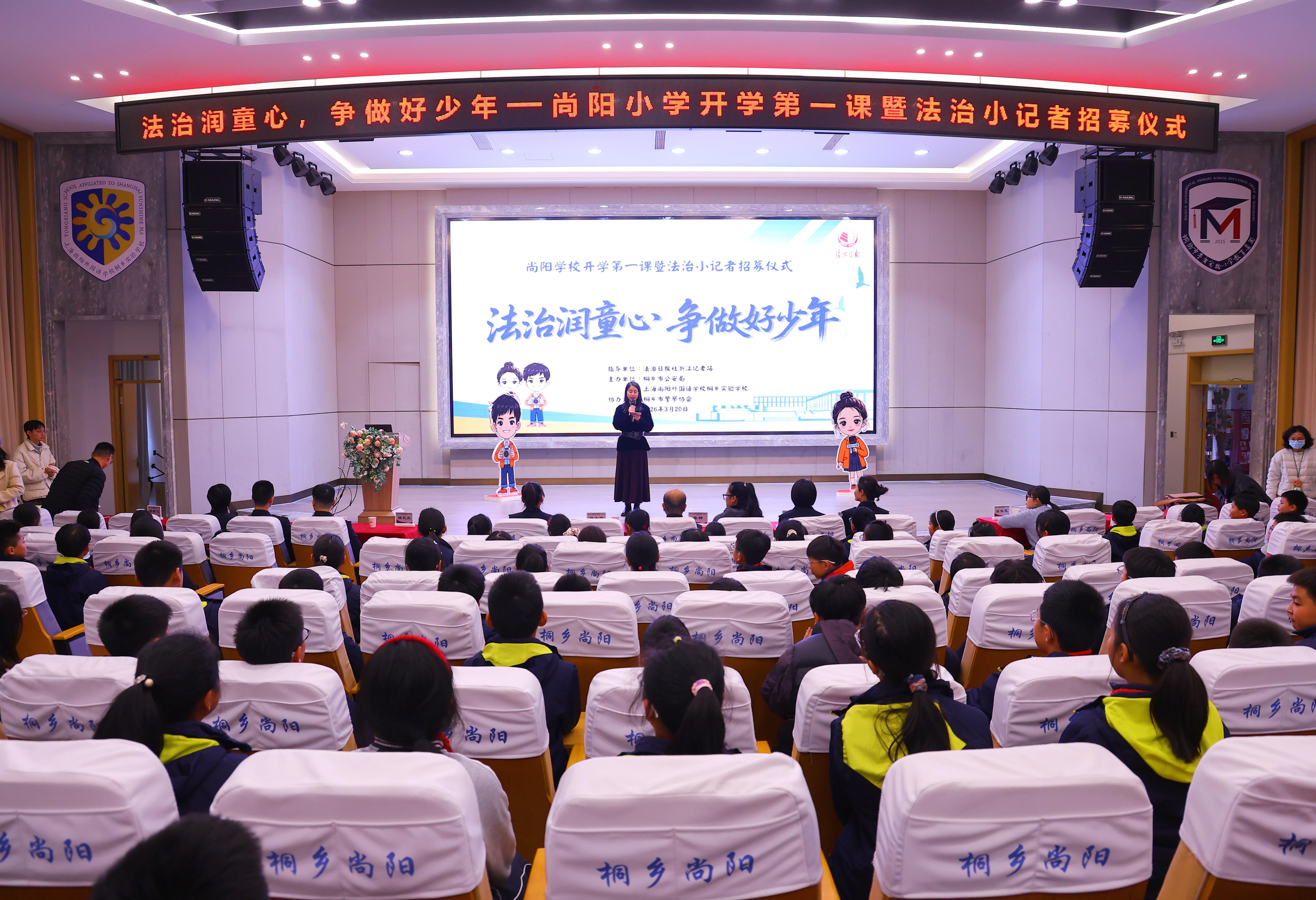 “學法用法,做遵紀守法的尚陽人;積極傳播,做法治精神的小喇叭!”3月20日下午,在上海尚陽外國語學校桐鄉(xiāng)實驗學校(以下簡稱“尚陽學校”)多功能報告廳內,五年級500余名學生集體起立,在“法治小記者”代表陳安桐的帶領下,一同舉起右拳進行了莊嚴的法治宣誓。