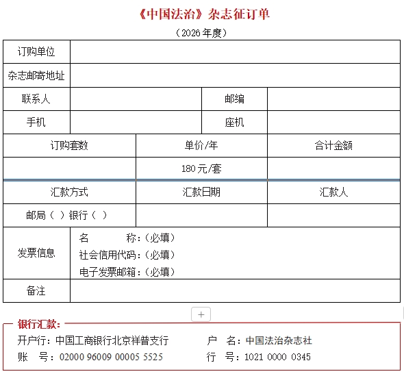 ★若不能進(jìn)行在線提交訂單,請(qǐng)將本征訂單填寫完整后與匯款憑證一并發(fā)郵件至zgfzfxb@moj.gov.cn;或添加微信13671053926后發(fā)送電子版征訂單與匯款憑證。