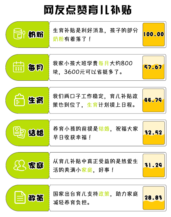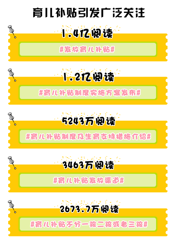 方案一經(jīng)發(fā)出,便迅速聚攏各方目光?!?發(fā)放育兒補貼#”“#育兒補貼制度實施方案發(fā)布#”相關(guān)微博話題,閱讀量均突破1.2億。“您家孩子是否符合申領(lǐng)要求”“您家孩子‘掙’到3600元了嗎”更成為了寶媽寶爸們?nèi)粘:训男聝?nèi)容。