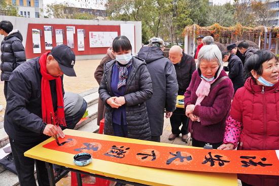 原來,當(dāng)天是三二五村的“新春送對聯(lián)”活動日。8時(shí)30分,村頭紅色文化廣場上已聚了不少人,書法家揮毫題聯(lián),觀眾喝彩聲不斷。匆匆趕來的黎伯忙前忙后,幫村里人布好紅紙,又用帶來的青磚壓住未干的春聯(lián)防止被風(fēng)吹跑。